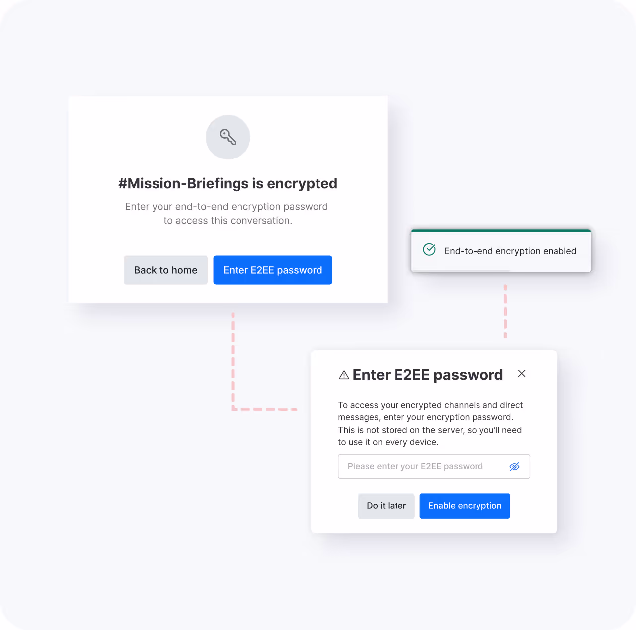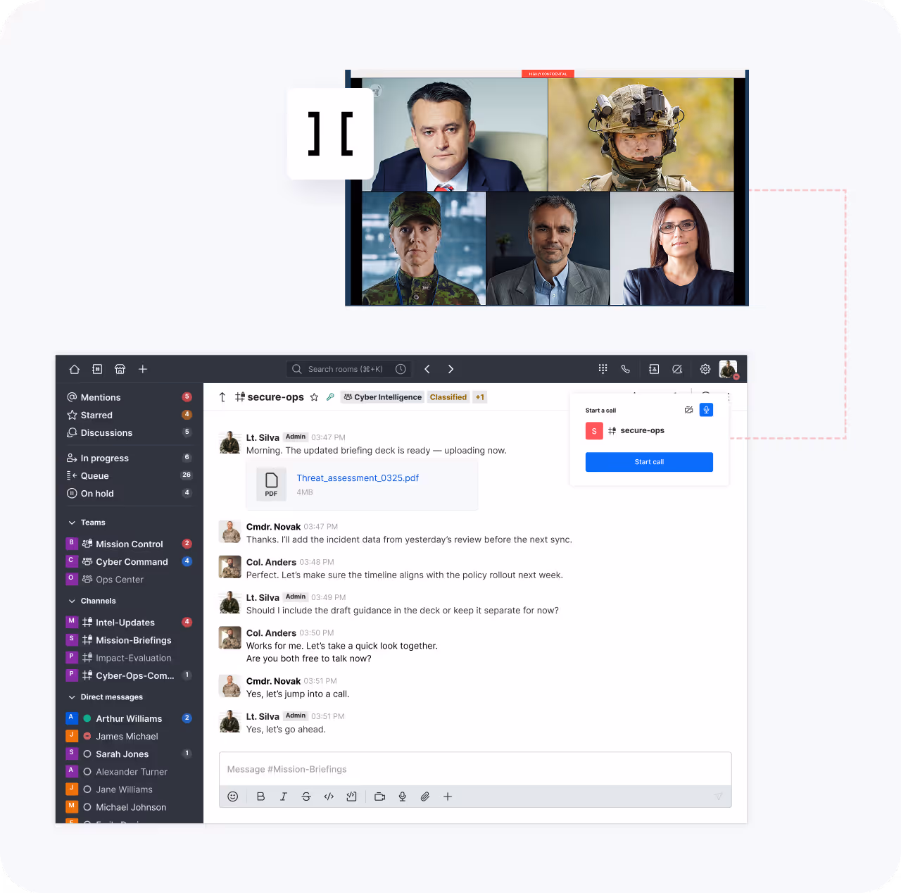 Messages are encrypted from origin to endpoint. Keys stay with intended recipients; keep sensitive chats off the record and off your servers in classified environments.