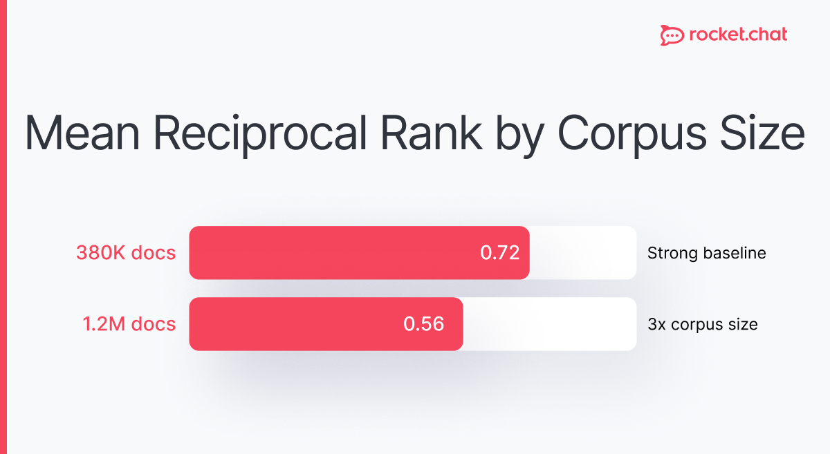 At around 380,000 documents, the system delivered strong results: a Mean Reciprocal Rank of 0.72, meaning the first relevant result was typically near the top of the list.