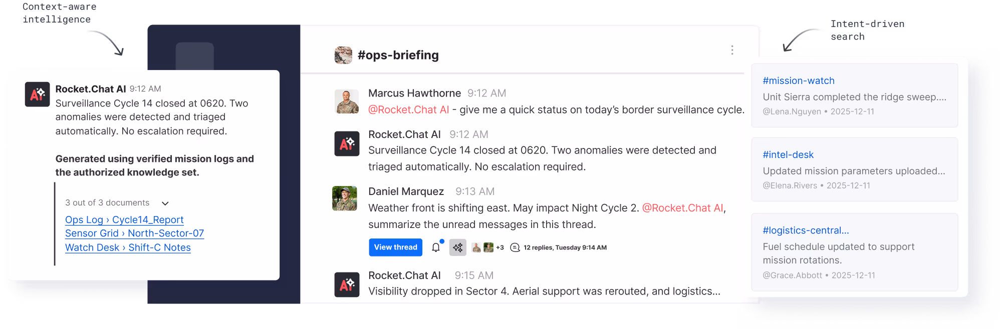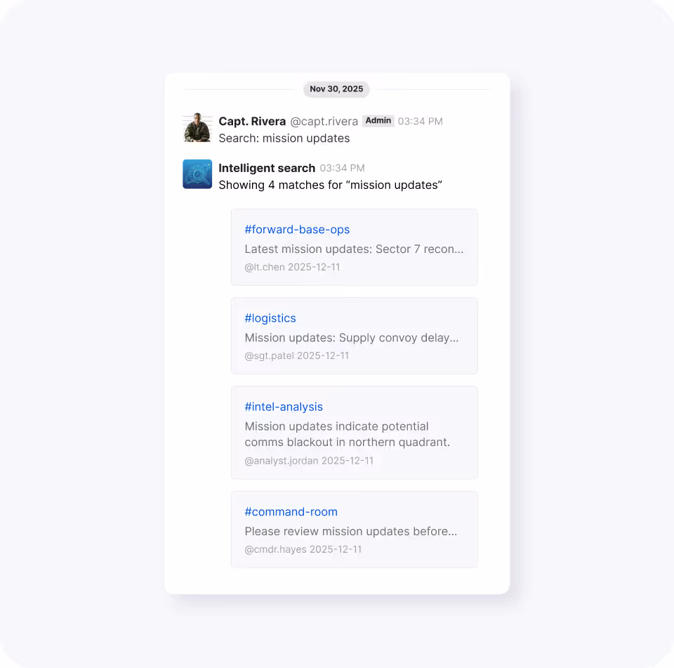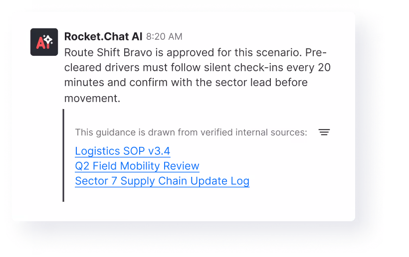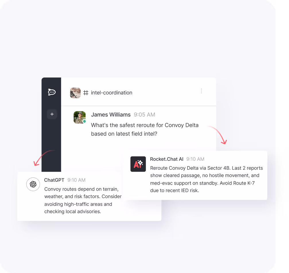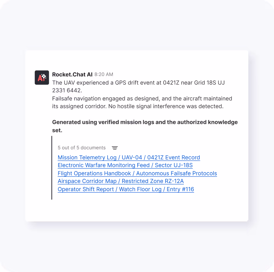 Rocket.Chat enables mission intelligence with sovereign AI, doctrine-aligned models, controlled access, and verified provenance so every insight is reliable, compliant, and operationally ready.